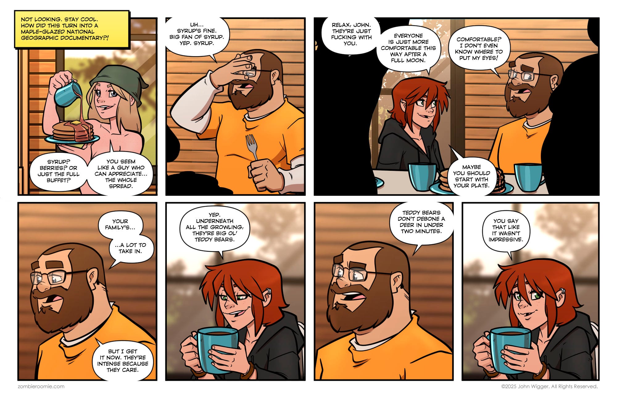 After this Family Matters arc ends, I'm changing up the main cast's looks. I've got a wholly new design for John that looks different, but still feels like him. George has more of a mullet, Zoey is still being worked out. John ended up needing the most change as his current look is basically just what he was at the end of the legacy timeline and so he feels older than he should at this point in the reboot. Lyn is probably the most similar going forward to her current look.
