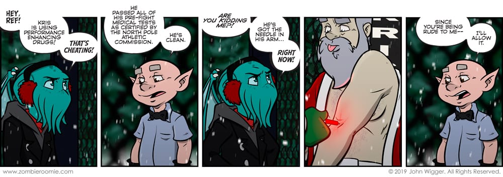 I like little elf Mills Lane. George comes to the ring in the next strip. I'm a fan of drawing characters with their tongues out whilst they're doing anything involving manual dexterity. I know it's a contrivance but it makes me laugh so it happens in ZR more than it would in the real world.