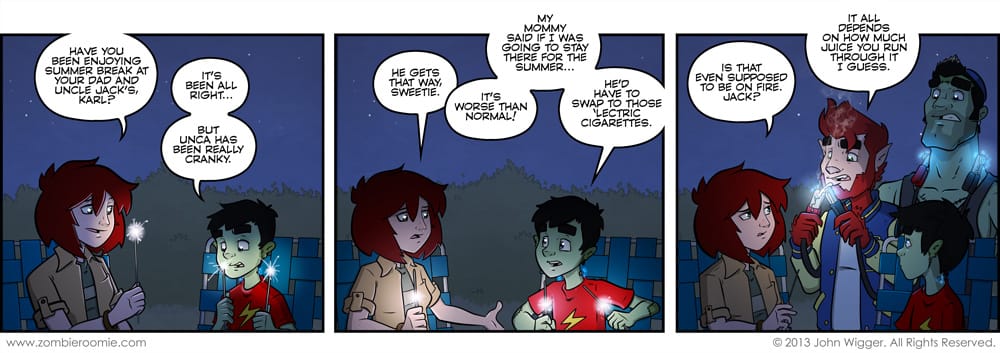 In coming up with strips and arcs for the Summer, I had a few that involved a kid... Rather than introduce a new kid to the cast, I decided to use Francis' son, Karl. So we'll be seeing more of him in the weeks and months to come. I like having Lyn without John. Not that I don't like them together, I just like having her be able to develop as more than just the girlfriend. It helps that she's Jack's sister so I have another group of characters for her to easily interact with. As it has been with a few recent strips, I also had to come up with where to place this strip. I didn't want it to be in the apartment since it involved smoking and John doesn't smoke. I also couldn't place it in a restaurant since most are non-smoking now. There was the possibility of the bar, but Karl shouldn't be in a bar. So outside it was. I then had to figure out something to have them do that wasn't just sitting around. Fireworks came to mind and I loved doing the lighting/effects.