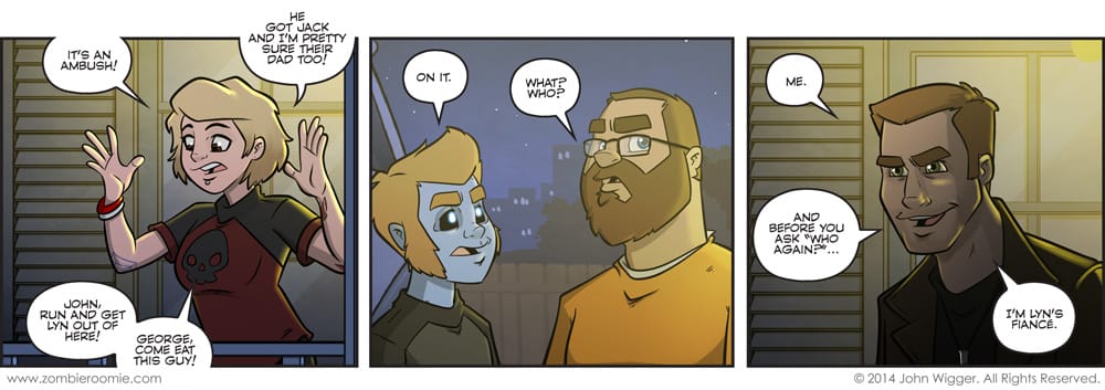 Okay, now we're getting to the important part of this arc. Zoey freaking out in panel one is one of my favorite drawings I've done lately. I don't know why, it just resonates with me. This arc and what spins out of it are going to have some repercussions regarding Lyn's past and we'll finally get to know more about who she was before she started dating John. It's something I've put off putting into the comic until I was able to get it "right" and have it have an impact and relate to who she's become in the last couple of years. I'm finally ready for that to happen.