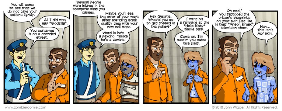 George has been pretty helpful of late... keeping John alive when the Jiang Shi showed up and now getting himself arrested so he could break him out of a Japanese prison. Pretty handy fella to have around. I never actually watched Prison Break when it was on, I just thought the idea of the main character getting the escape route tattooed on his body to escape with his brother was a neat idea. George can do it with someone else's epidermis to the same result.