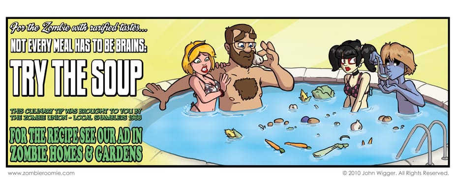 This joke where George is drinking from a pool is the first gag I came up with when creating what was to become Zombie Roomie. Human soup wherein the broth was created by sitting in a pool was something that I thought would be funny if a zombie were sipping from a ladle. I then continued to come up with zombie gag after zombie gag as they were effectively writing themselves.... So, I decided I needed to have one of the main characters be a zombie as that's what I wanted to write/draw a comic about. It was always planned to be a single panel comic, but the "A Zombie's Survival Guide" addition to it was new. I hadn't planned on doing these little Zombie Union propaganda bits way back in the beginning of the comic. I've updated Zoey's look a little, not much but I think she looks better. John's arm candy doesn't have a name currently, but she's not in the comic as of yet... if she ever actually becomes a character I'll be sure to name her. Her swimming suit is the interlocking lizards by M.C. Escher.
