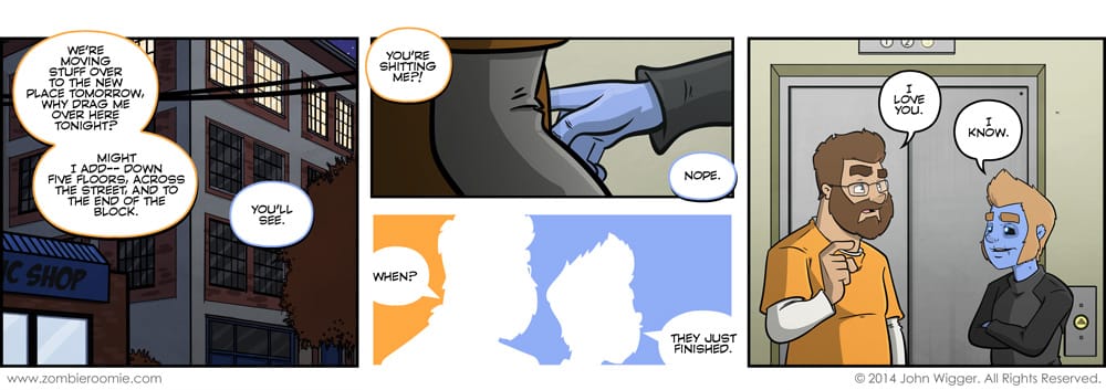 Today's my birthday. I'm spending it coloring freelance work. I tried thinking what the biggest luxury items each character would want in the new place-- and with John it was easily an elevator. They've lived on the fifth floor of a walk up building for several years now. He's tired of stairs. So today's comic was born.