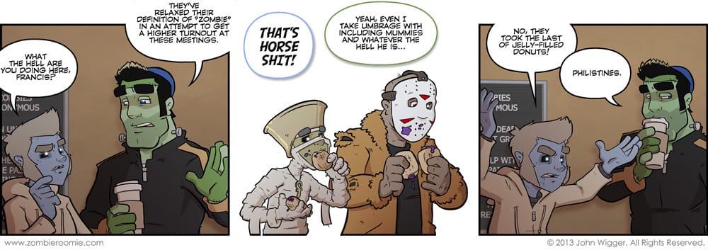 When I first started doing Zombie Roomie, I was really looking into the zombie fan culture on the internet and I saw the same question again and again... Were Frankenstein's monster, mummies, and Jason Voorhees considered zombies? Sure each of them is undead and reanimated some how... but each have things that count against them too. There were several "knock down, drag out" fights on various forums and podcasts about it. I figured it'd be something that would potentially piss George off too. Planning this arc, I was just going to have zombies in the group but I realized that the number of non-Union zombies in the area would be pretty low due to events last year. So adding these guys in to the support group gave me a chuckle.