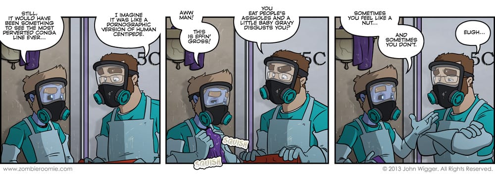 We're just going to call this arc over and done with. We don't need to see the actual wearing off of the magic... I don't do that sort of comic. I know George would be immune to any infectious pathogen in the spooge... I just thought it was funnier with him in the get up. Plus, it goes with him being grossed out. I've got an idea of where we're going next in the story strips... but I think I might do a flashback or two since it's on my mind. We'll see when we get there... but I need to plan the big end of October stuff (anniversary of Zombie Roomie) still.