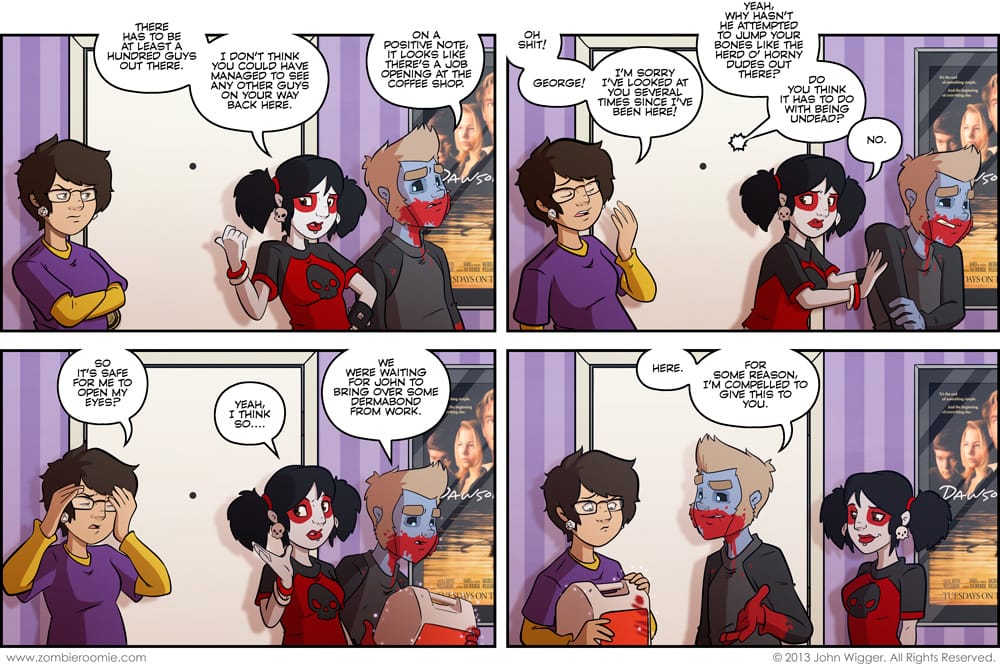 I was surprised nobody called me on the fact that Lizzy had seen George and he wasn't trying to do the nasty with her. But even so, this was planned from the beginning, since George having pieces fall off makes me laugh. I'm getting a tablet monitor later today so I'm going to test it out, if it's a really different experience-- I might end up doing something similar to the redesign week, but I've got to see how things shape out with it before I'll know how I'll like it. If things are fine, we'll just continue with the Lust arc.