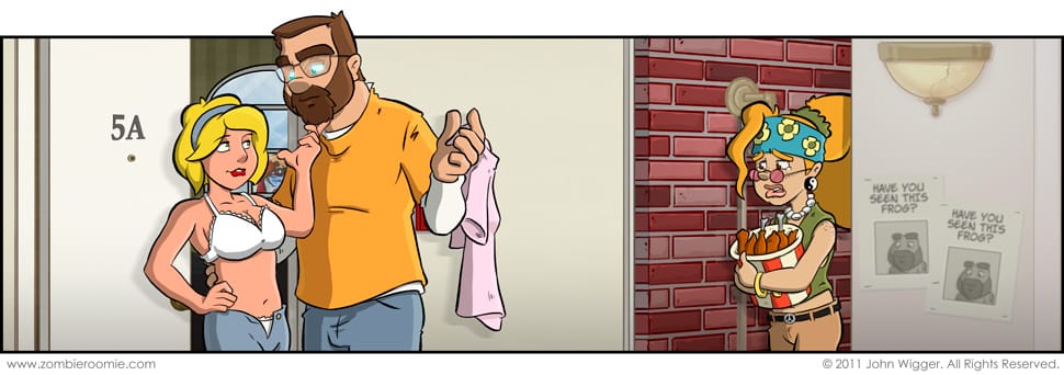 If you pay attention to what George was saying on Wednesday, you'll notice this strip is happening at the same time as Wednesday's "A Room with a View". Soon after this scene they've gone inside and have closed the door to get busy. I don't know why, but the idea that Valerie would decide to bring John chicken as a way to make up from their fight just seemed right. Although, it's also kind of like how The Batman doesn't use guns, since his parents were killed by a coward with a gun, but he shot Darkseid only to be "killed" afterward. Valerie breaking down and purchasing some of the Corporal's chicken could have only ended in sadness. I know none of you have the same connection to the characters that I do, but it was really hard for me to draw Valerie in today's comic. Not that it was a difficult drawing or anything... just when I got the expression down in the sketch layer and having to continue to work until it was finished... the look of the betrayal/sadness just made me feel bad.