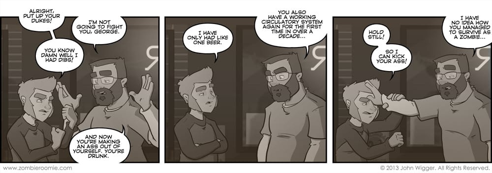 George as a human was a cheap date it would seem. I've mentioned George's drinking during his college days before, but there's a reason he was able to pound booze... It just went through him. He also likes to embellish a bit... The events during the time jump gave us a bit of a role reversal... George was the screw up and John had his shit together. We're seeing some of what helped put George on that path after getting dumped.