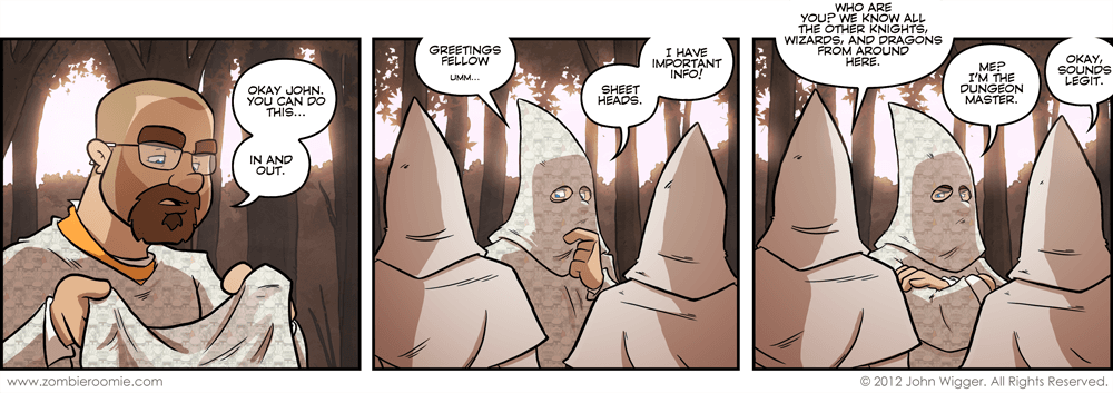Yeah, George's plan involves John infiltrating another hate group. What could go wrong? I also like the John commandeered George's sheets for the mission. He surely wasn't going to ruin his linens for this ridiculous plan. I have always thought it was hilarious that these guys chose names for their ranks like ghoul, magi, wizard, scribe, etc. It's like they opened up a copy of a Player's Handbook from D&D and said, "Yeah, that sounds effin' cool man!"