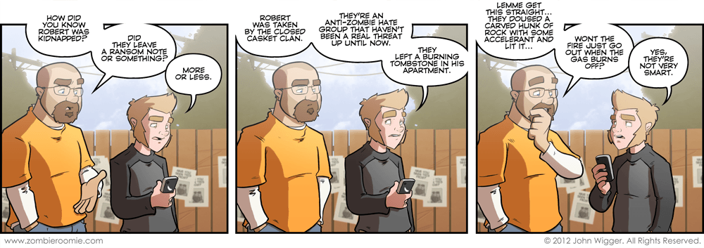 I have had the idea of including the idea that some folks are bigoted against zombies for a while. I decided that I'd have them show up for this arc around the time I was writing the "Cult of Personality" arc (where the zombie siege attacked the apartment). I figured that would give me more than enough set up to bring them in. I'm pretty pleased with how today's strip turned out. I put some extra effort in setting up the background and it feels like a sunny day. Some strips just "pop" and this one is one of those for me.