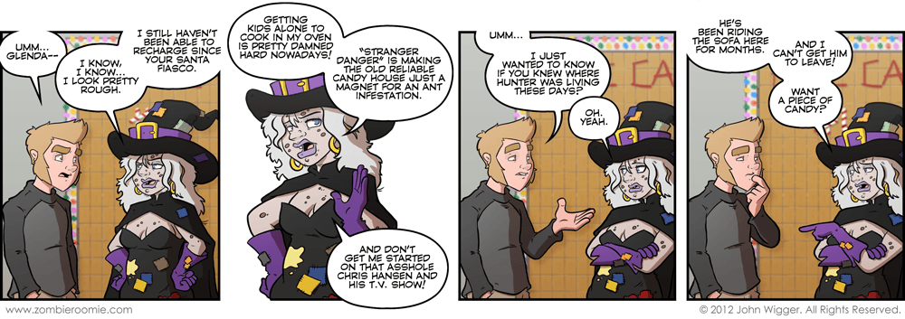 We haven't seen Glenda in months, not since the end of the "The year with a Santa Claus" arc. She's apparently had a hard time during her time off screen. Back in the Ask the Cast week I had someone ask about Glenda and her recharging of her magic... but I wanted to do this strip sometime later (read today) so I selected other questions to have the characters answer. Life is hard for a witch.