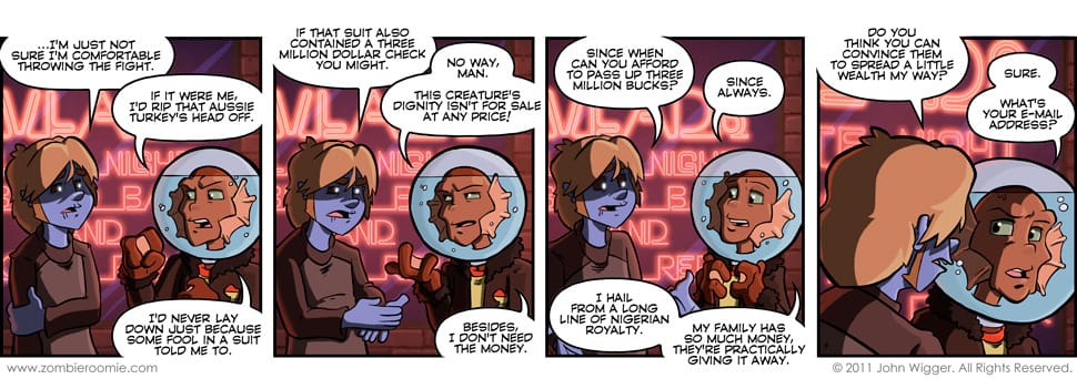 I've been wanting folks to get to know more about Jamal than just his stereotypical militant/protesting side for a bit. Yes, he's super rich, but he doesn't play it up . The only time I've hinted at it was when John tried sleeping in his pool house, he wore a Hugh Hefner style smoking jacket and his walls were really fancy. George and Jamal are outside of Vlad's here because it's time for another monster poker game which we'll see shortly. I changed up the sign from the last time I showed the outside of Vlad's to get the traditional neon tubing look. Also, I'm pretty pleased with the reverse 3/4s of George in panel 4. It's not 100% right, but it's close. Getting more angles to the characters that look dead on, correct is a goal of mine for the rest of the year.