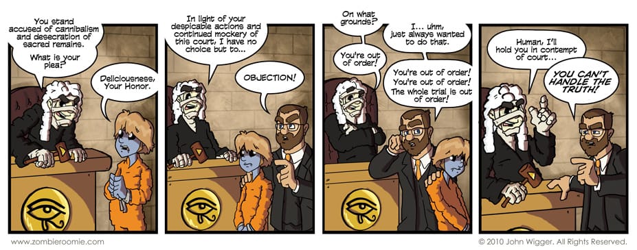 Well, it would seem that the Mummies weren't expecting to encounter such a giant dork who can quote movies at the drop of a hat for a defense! John busts out lines from classic courtroom dramas in today's comic. For those of you who can't place them, in panel three it's from "...And Justice for All" and in panel four it's, of course, Jack's famous line from "A Few Good Men". I really find the fact that the Mummy culture uses bandages for almost everything hilarious.... The judge's robes and wig, George's jumpsuit... It's that little idea of mine that made me laugh hard when the idea of Mummy COPS and a courtroom scene were originally pitched. I added the bandage based clothing concept and fell in love.
