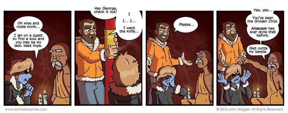 This joke here is the reason I wanted to have the guys go around the world and do wacky things. I knew I was going to have George constantly being a thorn in John's side... and the ability for John's dorkiness to screw over George was something I wanted to have happen. When I was in college and living in an apartment with my buddy, Andy, we'd take walks to Burger King and the like.... I'd take routes that I knew had city bus stops so I could do the "I want the knife" spin to the bus route map thingy on a pole. I laughed every time. Andy laughed the first few times.