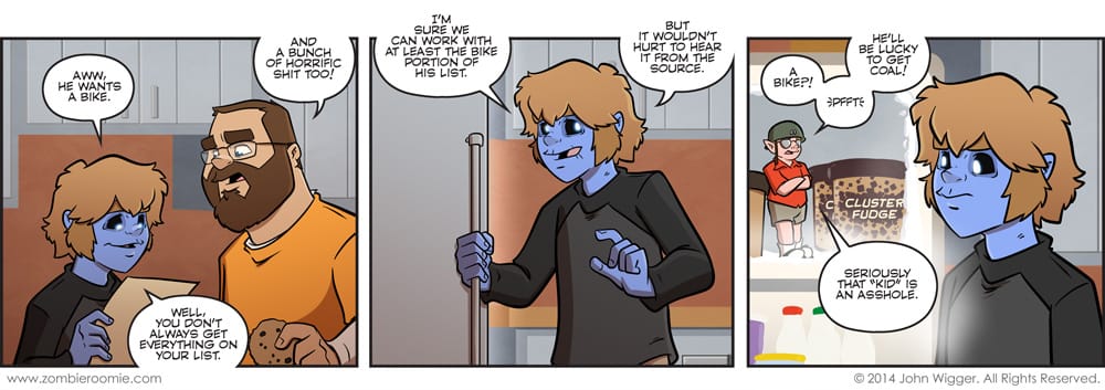 Ever since I did the zombie Santa arc I've wanted to have the elf live in their freezer... so I decided for this arc he just always had. Only George knew about it though. I don't know if it's just the fact that I don't have kids, but I find the idea of calling other people's kids assholes (not in front of the kids-- I'm not a monster) incredibly hilarious. Little kids are jerks... it's true. You might be thinking that your little angel isn't a jerk, but I'm willing to bet you're just biased and it's not that your kid isn't the statistical anomaly. Then again it just might be that I'm biased since I encounter most kids while I'm shopping.