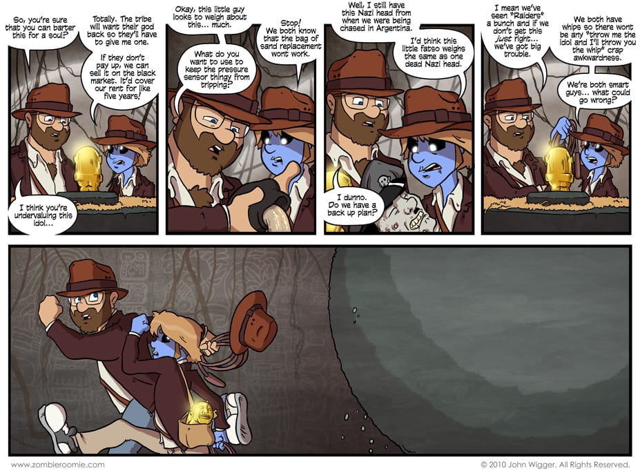 Yeah, some ancient temple is a pretty big jump from somewhere in the American Southwest, but I felt like doing this comic and if I didn't do it now, I wouldn't be able to as the remaining scripts for the road trip are in the Midwest. I love sticking the guys in costumes so having them both as Indy, that's pretty nifty in my book. It's also a crap ton of fedoras.