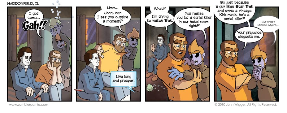 The guys have left the St. Louis area, where they live all though it hasn't directly been referenced in the strip to date... Due to George's anger at John's numerous stops to pee they have stopped off in a sleepy little town in Illinois. Also, that's right... Michael Myers wears a Captain Kirk mask. That's a little factoid that won me a bet in highschool that stated my buddy, Andy Triefenbach from the podcast Destroy the Brain, would owe me a billion dollars. I'm still waiting for said transaction. There's a coincidence here... he's been trying to sell a Michael Myers mask of his to make some cash. If you're interested in owning your own Myers mask, let him know... Perhaps it'll be the money that puts him over the billion so he can pay me what he owes.