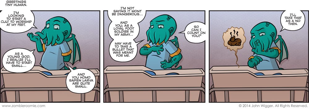 Like he said, you've got to start small. I like doing the poo/fart balloons rather than just a sound effect. I think it lends itself better to the comic strip. I also tend to only use sound effects for things happening off panel, I've noticed. It's just part of the comic strip language that I use in that way. I'm still wrestling with the Mr. Zed t shirt for him..