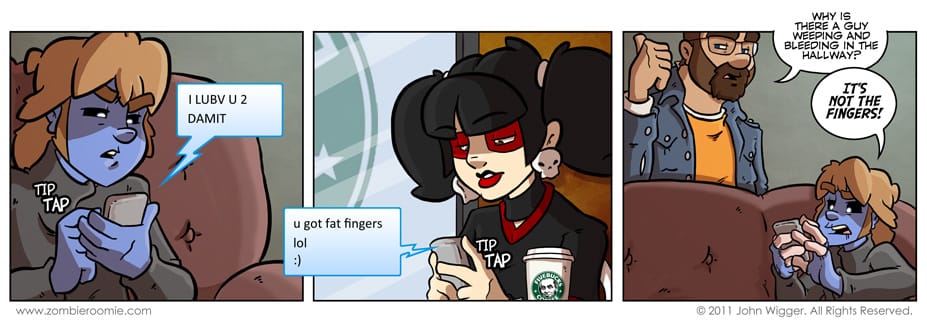 I've been pondering the next storyline for a while and while I was outlining it I decided to have a different twist/turn/what have you at the start... So, I wasn't ready to start it up since I want to make sure the whole arc makes sense. That explains why I did another one-off for today's comic. Fivebucks Coffee goes back to some of the earliest strips in the comic. Seen here, here, and here in various ways... it's the de facto coffee shop in the Zombie Roomie world. I've finally got the logo the way I want it though... it's a benefit of working on the same comic for a while and progressing in various ways. The familiar brands that are just a little different are something that I really like doing in the comic... Lenny's (Denny's), King Burger (Burger King), Burning Issue (Hot Topic), and Fivebucks Coffee (Starbucks Coffee). It's parody and world building all in one.