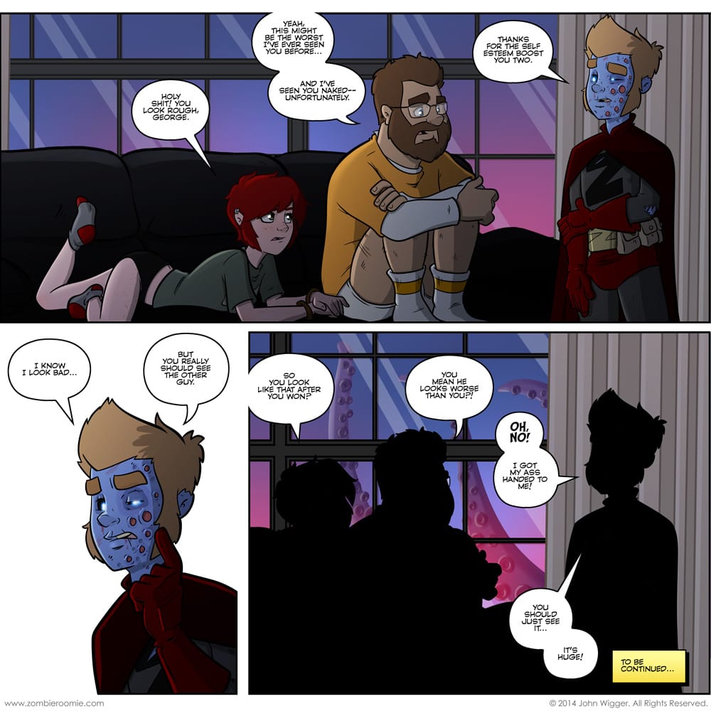 I wasn't happy with the way the rest of the Zombie-man arc was playing out when I was trying to write it... so I decided to kinda scrap it and merge in the next Zombie-man story I had planned. We'll get the same effective end with it, but also more~! With this arc, I'm finally able to introduce a character I created for ZR back around this time in 2011. I tried bringing it in when the guys were going to move up to the 5th floor of the old building and a few times since then... I just never had the "right" way to have it show up and not be super forced. This arc allows a natural and, if I may say so myself, humorous way to bring it in. I know I'm being super coy here, but it's my comic and I can do what I want. Read that in a Cartman voice please.