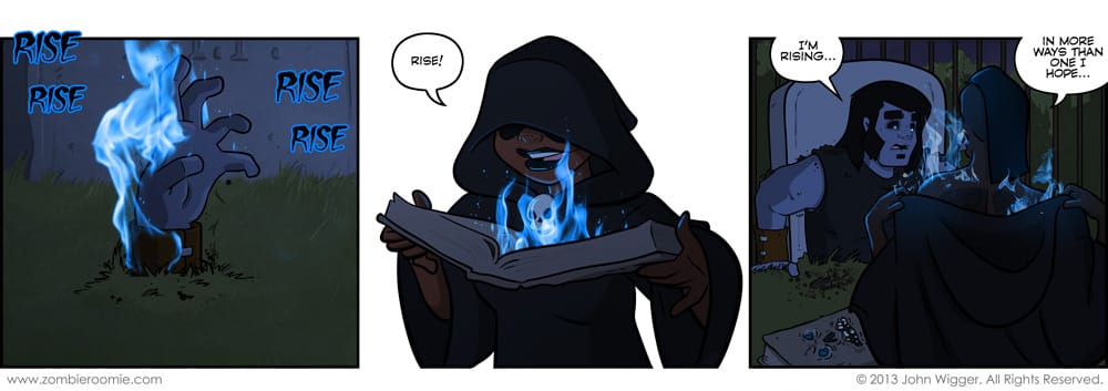 Since I wasn't going to finish the current arc by the anniversary, 10-26, I decided that we needed something cryptic that will come into play in the next arc. Folks have wondered where Robert has been. It turns out he's been buried the whole time. George buried him... alive? This happened about a year ago and we haven't seen him since. Who is this mystery woman? Well, that's a big part of the mystery so I'm not going to tell you yet. Also, since it is the forth anniversary of Zombie Roomie... I treated myself and bought a 22" HD Cintiq from Wacom. It's an expensive item, but with as much work with digital drawing as I do I think it's worth it. I'll be getting it Monday so Wednesday's comic will be done on a new device. I'm very excited to get it!