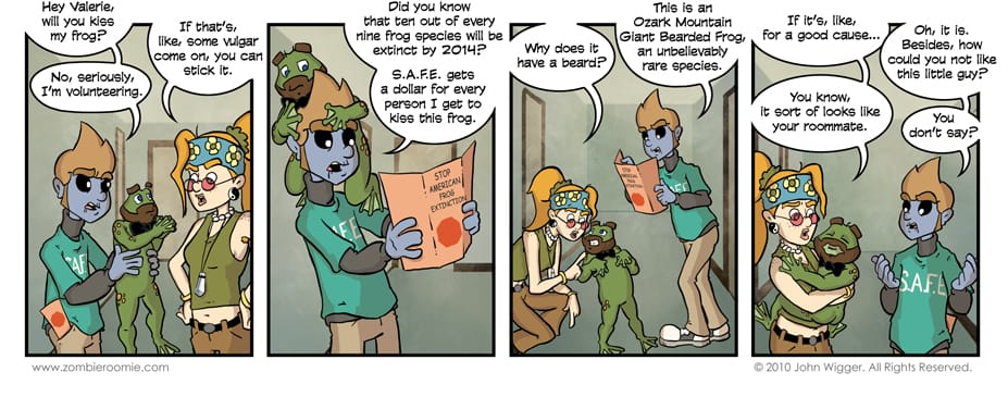 Stop American Frog Extinction! Save an endangered species! Join S.A.F.E. today! Next week we're starting a major storyline that will shape Zombie Roomie for the better part of the year~! Check it out.