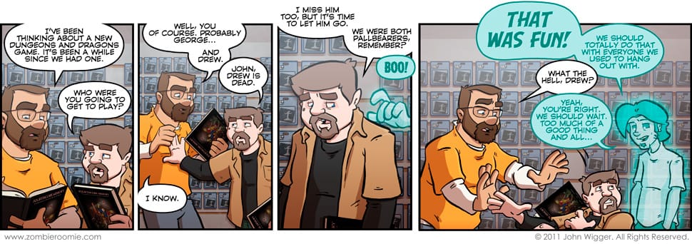 For those of you who haven't been with Zombie Roomie for the long haul, or those of you who have forgotten... Drew was John's roommate before George. Also, before George ate him. But until now his return, as a ghost, hasn't been common knowledge to all of John's friends. John and Bill hadn't been hanging out for over a year, mainly due to the search for George's soul... so it may have just slipped John's mind and he didn't inform Bill of their old friend's new ectoplasmic existence.