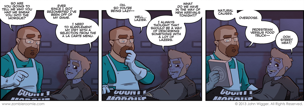 This was another of the dumb zombie jokes I came up with a while ago. In addition to the dumb joke, there's a grain of upcoming story arc information in this. George isn't performing up to his old standards. That's going to be a thing down the road. Years ago for a role playing game I did the medical examiner's symbol thing and never actually used it. When I was planning to add details to stuff for this strip I remembered it and added it to the back of the metal clipboard/paper work thingy that John has in panel three. It's handy that I'm a digital hoarder sometimes.