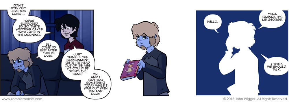 In an ideal world, I'd have done this as a Friday strip to leave you guys hanging for the weekend... But I didn't plan the arc around cliffhangers so you get it on a Monday instead. I wanted this strip to be very, very blue... I even thought about having it be only shades of blue, but it might have been too much so I pulled back. I'm a total color theory dork and sometimes it gets the best of me. I retooled George's goatee a little. One of my favorite features on George is his shovel shaped jawline. I felt that the previous version of his chin scruff detracted too much from that so I went back in and changed it up a bit. I think I'm happier with it now. And no, I'm not going to go into what the phone call is referring to. I'm sure a lot of you can figure it out based on the clues... but you'll have to suffer until Wednesday or so.