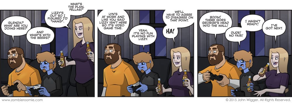 I figured we needed a "guys" night as part of this section of the arc. I also like the idea that they're using the time they have without Lizzy being there to school them. This strip doesn't really have a standard punchline... but I just thought the whole situation was silly so I went with it. It's also a nice strip for humanizing Glenda to other characters that aren't Lizzy... so there's that at least.