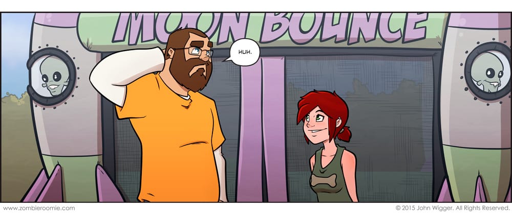 Lyn found a substitute for the moon it would appear. I was trying to figure out a stupid alien design for the rocket sides and I remembered I already have a stupid alien in ZR so I figure they've abducted enough people in the comic's world that their look is common place. I'm still messing around with Lyn's hair but her in this update makes her look even more adorable. I think I'm on the right track.