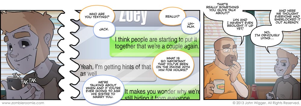The screen treatment in panel two was something I really thought hard about. On one hand, I wanted it to be recognizable that this was texting back and forth between George and Zoey... but in the ZR universe (and some other comics as well) it's not Apple, but Banana that makes the de facto smartphones that people use. That made me want to change up the colors to yellows and browns-- 'cause you know, bananas. But I didn't for the first reason. I realize that everyone reading this is several steps ahead of the characters in the strip and you have been well aware that George and Zoey are hiding the fact that they've been back together for some period of time... but there's things that we're leading up to that requires John and Lizzy to appear a little clueless right now. It's on purpose.