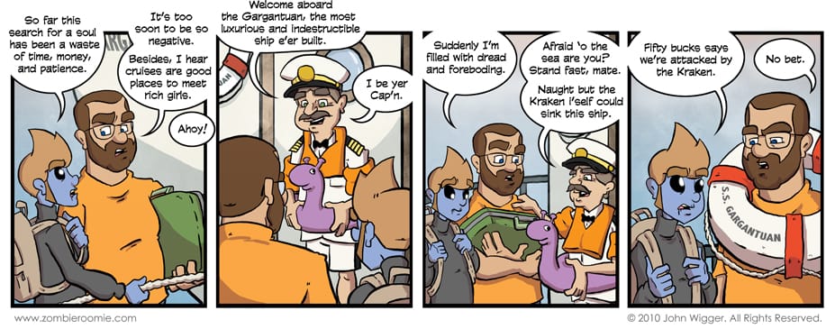 Apparently the guys have spent far too much time on the East Coast of the United States for George's liking. They've booked passage across the Atlantic on the Gargantuan ocean liner... nothing bad could happen... it's fool proof.