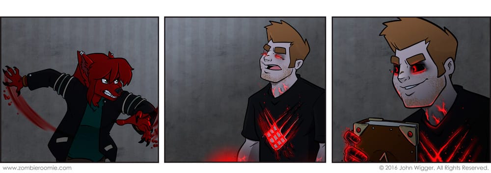 More of the one on one fight. There's a bit more before the fight is over and it's going to get intense... at least I hope the tension builds the way I planned it to. Blaine's fetish based magic is very fun for me to explore how he powers up. I really enjoy doing special effects like glows in this style. So these strips are really interesting to do. I'm not saying every strip without them is boring or a chore, but there's a reason I added these powers to the cast's arsenal.