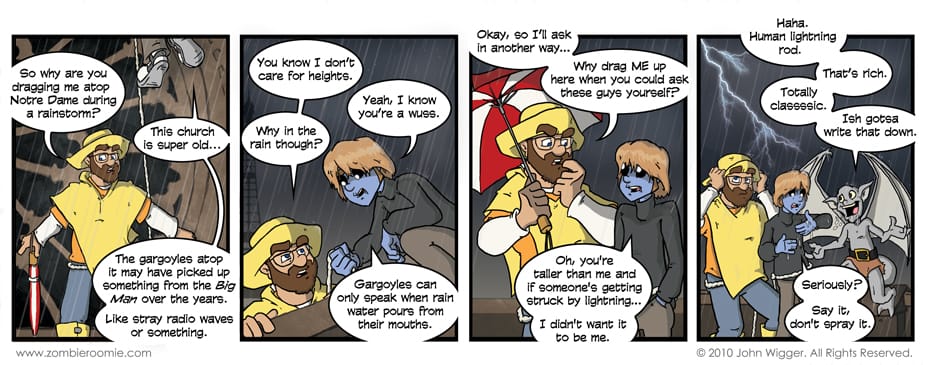 Rain, rain... go away. Come back again some other day. I don't recall what the name of the show was, but years ago I watched some random cartoon on PBS about a group of kids where one of them was turned into a gargoyle and he could only speak when water poured from his mouth. That was the first instance I can recall of hearing of "gargoyle speak". I thought it was a neat affectation for any species. Hence the nature of today's joke. Also, ever since the cancellation of Disney's Gargoyles your everyday gargoyle is starved for attention it would seem.