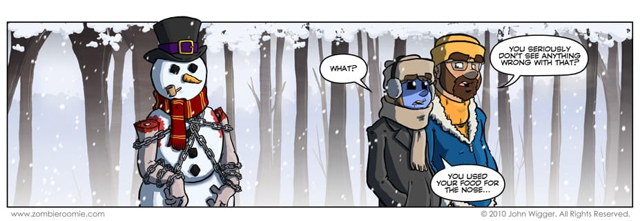 Yesterday was the first snowfall of the year for me so when I sat down to figure out what comic I wanted to draw for you guys... I came to the realization that I wanted to do something about snow. I changed up the woods scene to include a fresh snowfall and went back to the winter-time comics from last year to get the costuming the same for both John and George. Since last year I've gotten better at getting the snow to look more like it's falling and like the flakes are just caught it in the middle of their fall to Earth... It's a simple motion blur filter in Photoshop, by the way. I like to have the scenes in the cold show only John has the steamy breath... it's a small and subtle detail, but it's something I've done since last year. George has never had it.