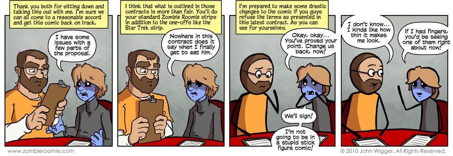 Thanks for letting me do this little wacky bunch of comics lately. I wanted to take a break from doing actual story based comics for a bit in between the World Tour and this next upcoming story. The next story is far shorter than the World Tour, but I still needed to decompress a little before I jumped into it. These comics where John & George rebelled against Zombie Roomie have been done fairly off the cuff, as I didn't want to work on something that has been planned for months ahead of time like the World Tour and the upcoming stuff. I had the idea for the Star Trek strip and the follow up... but, I didn't actually want to draw the follow up when it came time to... so, I came up with the idea of John & George hating the script and thereby the guys would refuse to work on the comic for a while giving me some strips to play around with. The last few strips aren't canon in the sense that they're out of the real continuity of the comic, but they're just fun exercises with the characters in a quasi 4th wall environment. I'm not sure if I'll play around with this kind of strip again in the future, but it was fun to escape to for now.
