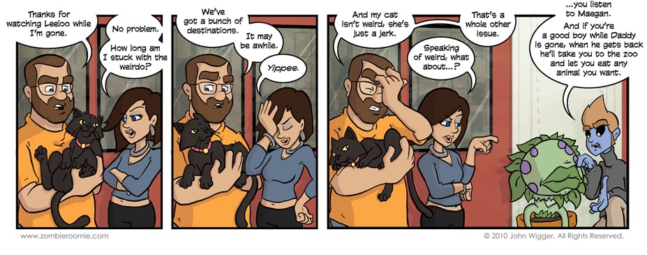 John's sister, Maegan, makes her second appearance in the strip. Her first time showing up was right before the start of the Christmas storyline back in, A little off the top. This is the first time where we actually mention the name of John's cat. Her name is Leeloo, and yes, John is that big of a nerd to name his cat after a character in a scifi flick. Also, the guys are on the road come Wednesday... Check back for that will ya?