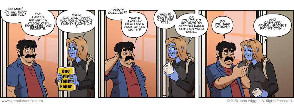 Steve has been a super minor character that has appeared in two ZR strips in the past and even a page of Gutters that I drew for Blind Ferret. He owns the comic store next to the main casts' building. I'm really pleased with his update especially in panel one.