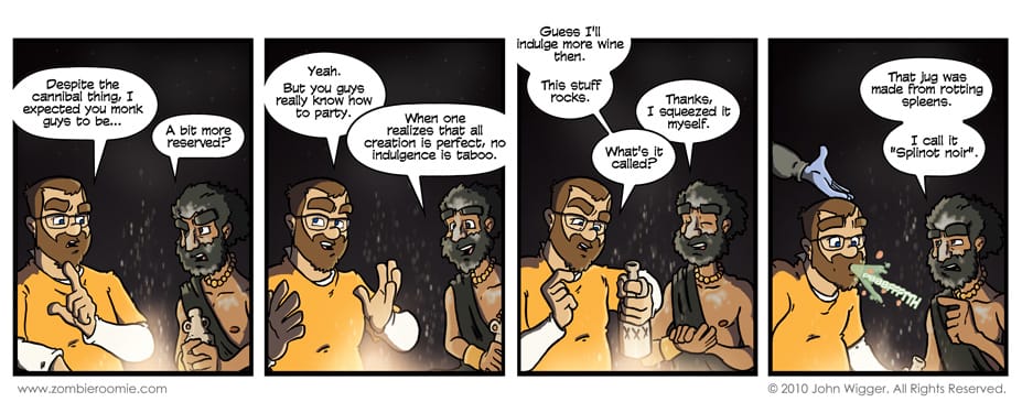 John and George took up the Aghori monk on his offer to come to the feast. I wanted to play around with some fire effects so I placed a campfire in the foreground and we're seeing the sparks and glow from it. I think it kinda works. Fire is hard to get 'right'. Folks enjoyed the gross out on John in the last comic's panel four, so I did it again with this one. Hope you enjoyed it too. As a bit of technical trivia... this comic had me using the largest brush to do the line work to date. I jumped up to a 12 point brush in Photoshop. It's part of my attempt to get a wider variety of line width into Zombie Roomie. It's difficult to see since the comic is a dark scene, but I like the way it turned out.