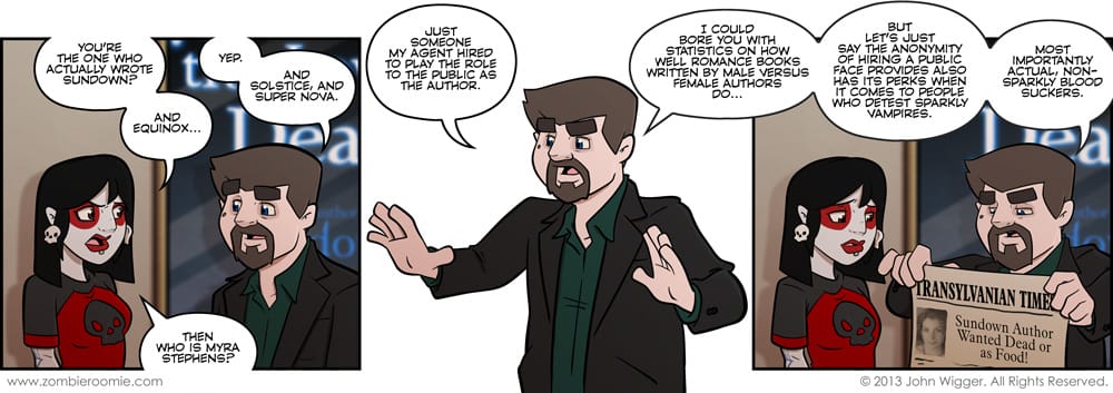 In a world with actual, non-sparkly vampires... fictional, sparkly vampires can be a nuisance. I felt it was time to spell out the confusion behind the "fake" author of Sundown... and Zoey's realization about the true author of the novels she's dug since ZR started. There is more to Zoey and Bill's conversation that I want to get in somewhere, but I'm afraid it isn't punchy enough on it's own-- it was planned for today's panel three even, but I pulled it. It might be something that can be tossed in a setup for the upcoming strips or used in an epilogue as it's important to events that have already transpired earlier this year. Fun fact: "English meaning of the name Myra for a girl: poetic invention." Seemed appropriate for today's strip.