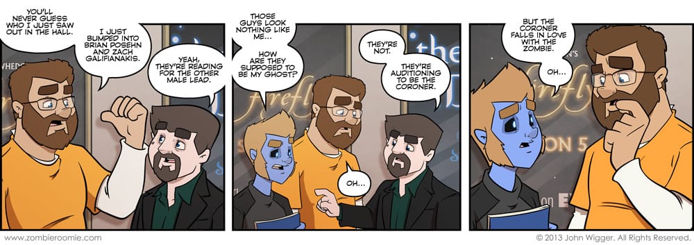 I figured we've screwed around enough and it was time to get to the actual work of getting this television show off the ground! You wouldn't believe the number of people who have made the crack about how the comic should have been about John and George being a couple. That never crossed my mind when I was coming up with the strip... but it's the first thing that a lot of people suggest when they hear about the premise. Several folks thought John was gay until the short bit with Valerie the hippie... so maybe that's where they get it. I don't know, but I took it for the characters in the television show in the comic.