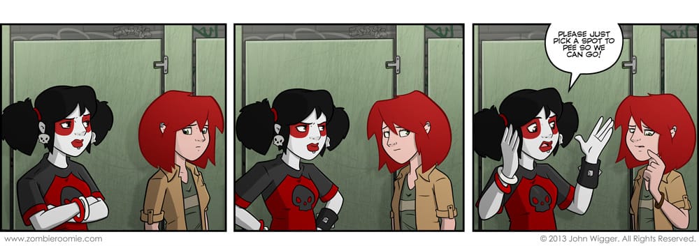 I did a quick poll on various social media stuff associated with Zombie Roomie and to have the characters do road trip stuff on the way to the television show was overwhelmingly requested. That also means Zoey didn't fly ahead as she's needed for this week and the next. Also, the last few times Lyn has appeared I was trying something that essentially didn't work for her so I spent some time reworking her look. I went back a bit and added some new things that I'm happy with, like giving her colored line art for her hair. I think it'll be even more noticeable and striking when she wolfs out.