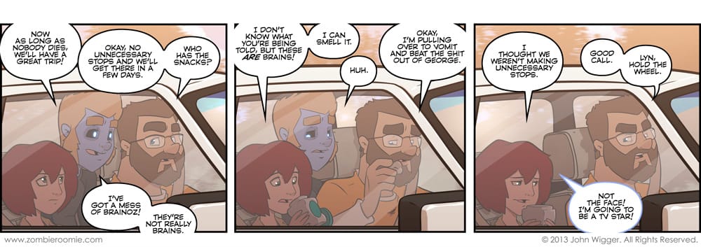 Yeah, Brainoz is a giant scam. It's 100% brain instead of 100% brain free... We'll get back to this in a bit. I'm not sure if Zoey is in the back seat too or if she flew ahead. That'll be determined by how the next few strips come together when I flesh them out.