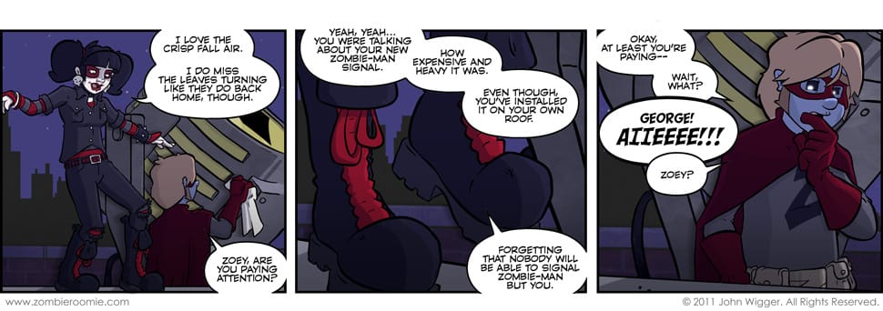 I'm doing a week of Zombie-man and Zombie-man related strips. I've had the idea for these for a while, including at least one of them since I came up with the idea that George would be moonlighting as a superhero. I think this is only the second time I've drawn Zoey from head to toe in a comic, the first being back in the double date arc. The standard layout I go with doesn't always lend itself to me having the characters' entire bodies in the panel, but when I do it I tend to like it... I should probably remember that and try to do it more often. The fact that George was so gung-ho about having his on Zombie-man signal that he installed it on top of the apartment building instead of having the police place it above city hall or something is the kind of thing that just makes me giggle. I also love the idea that Zoey let him do it and would just point it out to let him know he made a mistake... too bad she might not be able to enjoy the fact too much longer. To be continued on Wednesday...