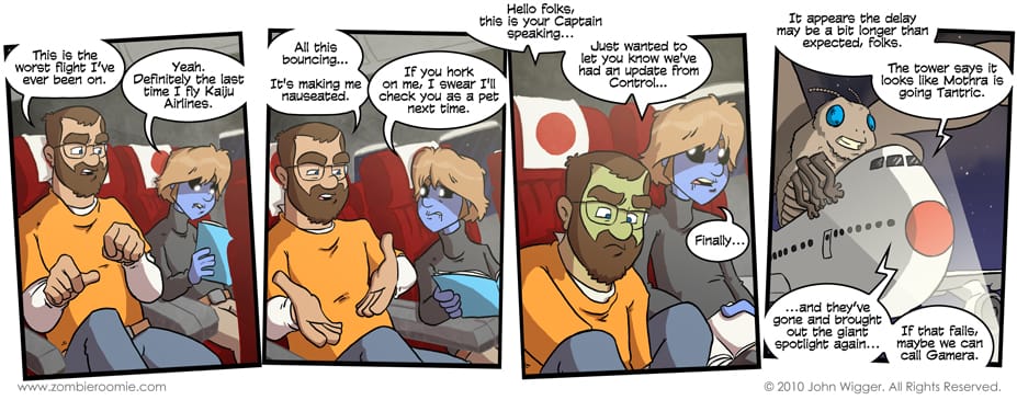 With the guys escaping from a Japanese prison, they decided they should probably just leave the country and not dilly-dally around in the land of the rising sun. But, it would seem their plane is suffering from an unexpected delay. Yes, the Simpsons did a gag where there was giant monsters interfering with a plane take-off too, but it didn't have a giant horny moth fornicating with a 747... take that Matt Groening. I was at a loss on how to portray the bouncy nature of today's comic and I didn't want to just do motion lines or apply motion blurs to everything... Then I thought up the tilted panels and figured that it worked just fine. I like the effect. It's subtle but gets the message across in my opinion.
