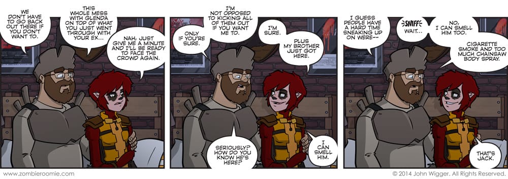 There's a couple side Jack stories to come in this arc and I wanted to give John and Lyn a few moments to breathe after the Glenda incident before hurricane Jack comes to town. A while ago I did one of the Zombie Survival Guide things where it's Chainsaw Body Spray instead of Axe and this was just a nice call back to that. Chainsaws are more zombie appropriate than axes for some reason... I blame Bruce Campbell.