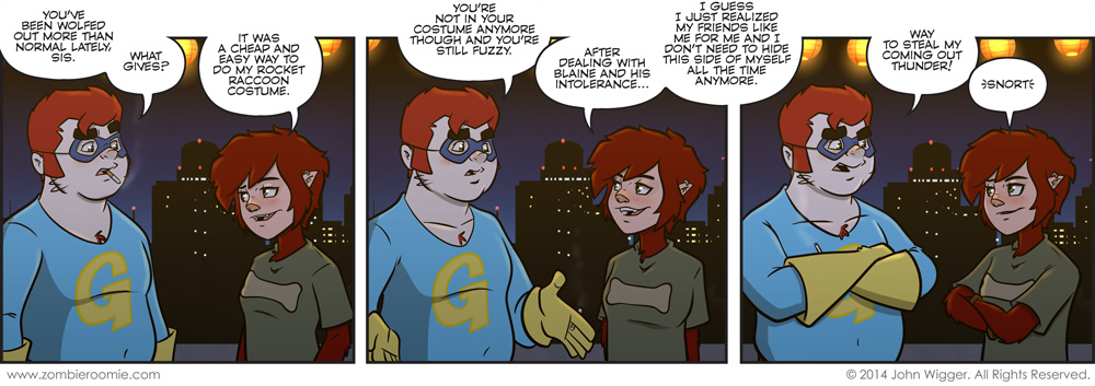 When I was writing the Blaine arc a big part of it was Lyn getting over her past... we're still not 100% there but all of the shoes have yet to drop coming out of that story. A big part of that was to help explain why Lyn wasn't in her werewolf form more often like Jack was. Lyn will still be her human self a lot of the time, but it wont take her fighting to wolf out anymore. You'll notice that's been the only times she's been a wolf before-- when she's had to kick some ass or strips following said ass kicking. Another side to this is Jack being more willing to be in his human form after coming out. It's kind of poetic that the two of them went through things to only have them swap what form they take. It's like I planned that or something...