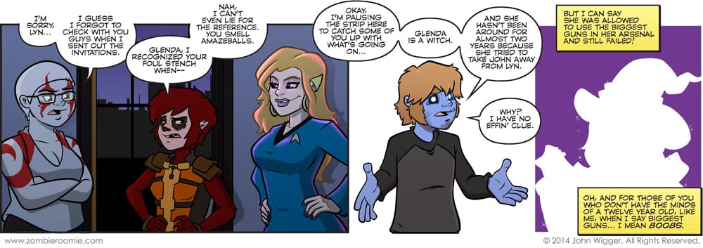 I was trying to think of the easiest way to reintroduce Glenda to the comic and I figured doing a strip that actually brought up the fact that she has been absent and why was the best course of action... Plus I like when George breaks the fourth wall. I've drawn new Glenda a couple times now but I haven't really nailed her design yet. I'll get there, but it's something that needs work. I've also decided that Lizzy is going to pull off the bald cap for the next strip she's in as I prefer her new hair to the fake, bald look. Speaking of new looks... I'm a big fan of scruffy-face George so I think that's going to stick around.