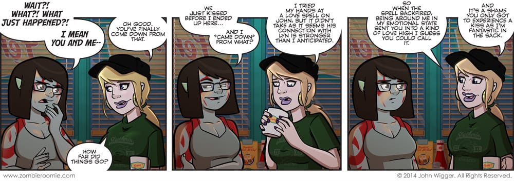 I really wanted to have Glenda in a casual get up as we've never seen her in one. The Star Trek costume was the first time we've seen her not in some manner of witch clothing... so since she was only wearing that to bait John and that didn't turn out well, she changed. This isn't the end of Lizzy and Glenda... it's just the end of them in this arc. We'll get back to them in a following story that we can focus on their goings on without having to jump around like we're doing in this party story. And since Lizzy is wearing paint, I figured it was time for some of it to start getting smudged off.